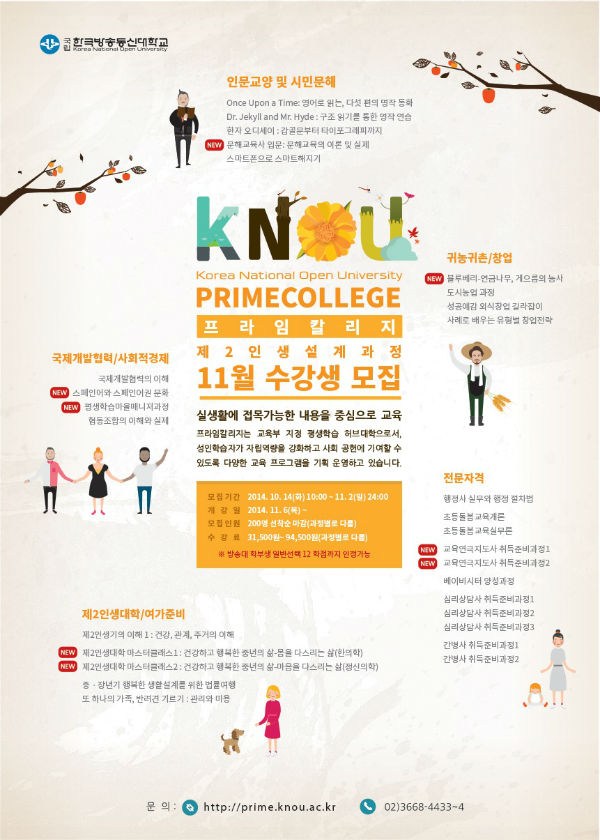 방송통신대 프라임칼리지 제2인생설계과정의 11월 강좌를 열고 10월 14일부터 11월 2일까지 수강생을 모집한다.