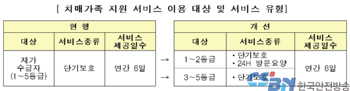 또한, 5등급 치매수급자의 일상생활을 지원하기 위해 서비스 시간을 확대하며, 1∼4등급 치매수급자에게도 본인이 원하면 인지자극 프로그램을 제공한다.
