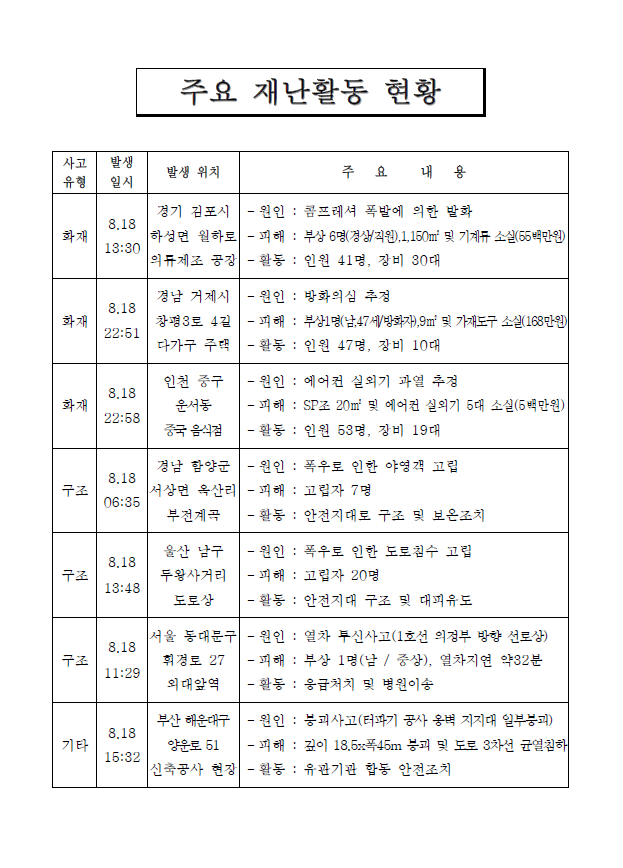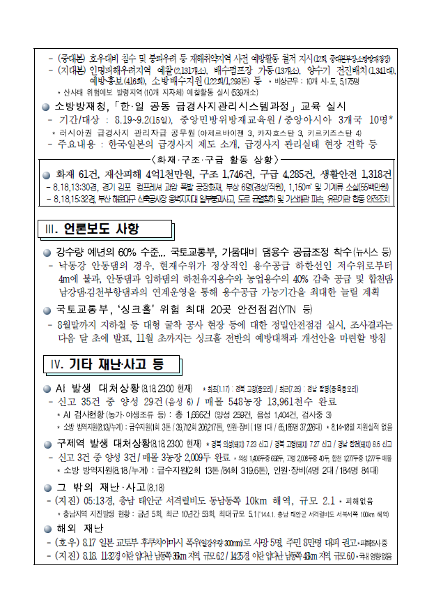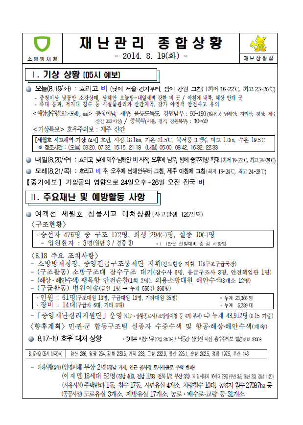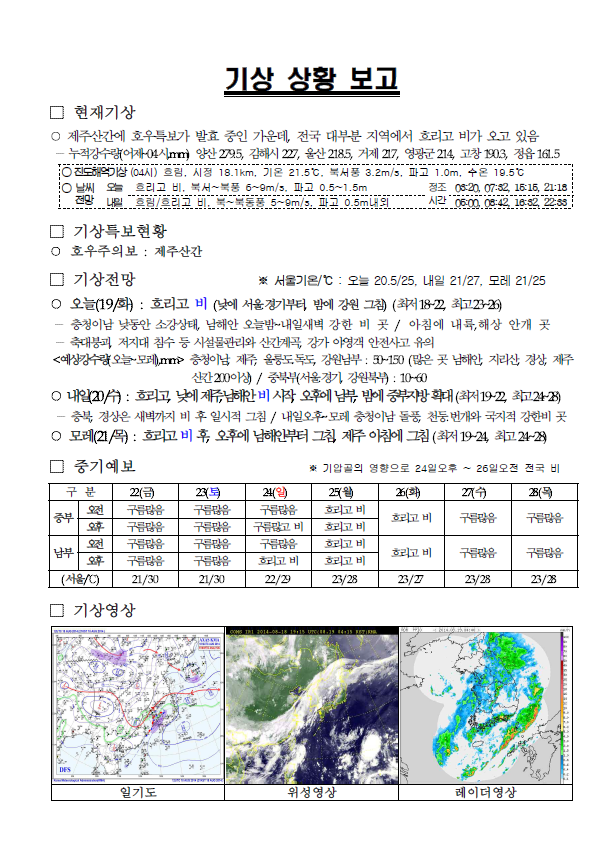 - 축대 붕괴, 저지대 침수 등 시설물관리와 산간계곡, 강가 야영객 안전사고 유의