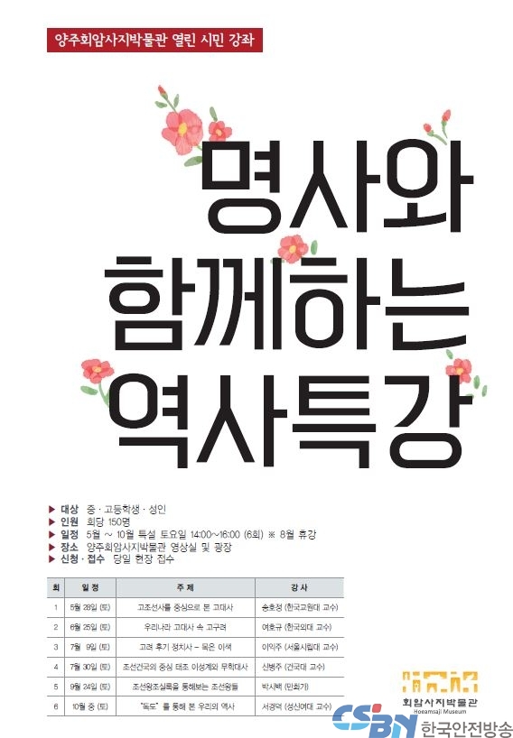 (한국안전방송) 양주회암사지박물관은 오는 5월 28일부터 10월까지 매월 마지막주 토요일에 ‘열린 시민강좌 명사와 함께하는 역사특강’을 운영한다고 밝혔다.