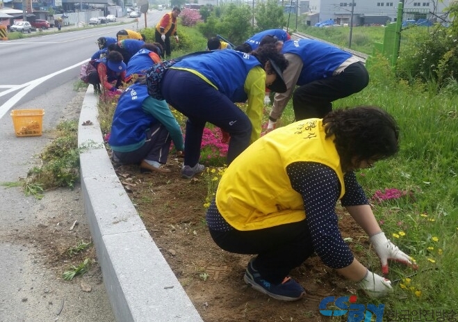 이날 직원과 자원봉사자, 바르게살기협의회 회원 등 30명은 청람리 개미고개 무궁화동산(500㎡)과 심중리 사계패랭이 화단(800㎡)에서 잡초를 제거하느라 구슬땀을 흘렸다.