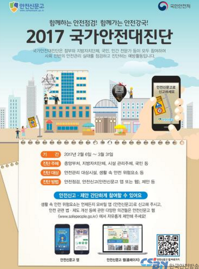 (한국안전방송) 제주특별자치도 안전관리실은 2017년 2월 6일부터 3월 31일까지 54일간 도시화·산업화에 따른 대형건설공사장 증가 및 기후변화 등 각종 재난·안전 위험으로부터 도민의 생명과 재산을 보호하고 특히 최근 들어 대형공사장 등에서 크고 작은 인명사고가 발생한 사례가 낮던 점을 중시하여 철저한 점검을 통하여 안전의식 제고를 통한 재난 등 안전사고에 대해 선제적 예방을 위하여 2017년 국가안전대진단을 실시해 나갈 것이라고 밝혔다.