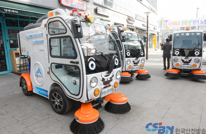 전기노면청소차는 하루 4시간 충전하여 8시간 작업이 가능하고, 도심·상가·주거지역의 미세먼지와 분진 청소에 유용하며, 전기모터로 구동되어 매연과 소음이 없는 것이 특징이다.