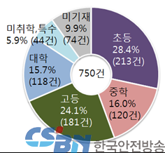 분석결과 성폭력이 발생한 학교급별로는 초등학교가 213건(28.4%)으로 가장 많았으며, 고등학교 181건(24.1%), 중학교 120건(16.0%), 대학교 118건(15.7%) 순이었다.