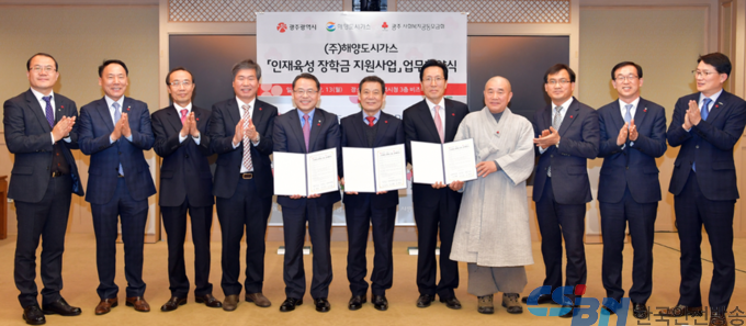 (한국안전방송) 광주광역시와 ㈜해양도시가스, 광주사회복지공동모금회는 13일 시청 3층 비즈니스룸에서 ‘인재육성 장학금 지원사업 업무협약’을 체결하고 2년간 총 1억2800만원의 장학금을 지원키로 했다고 밝혔다.