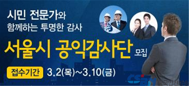 (한국안전방송) 서울특별시가 시민의 기대에 부응하면서도 내외부 다양한 시각을 반영한 투명하고 공정한 감사시스템을 정착시키고자 일반시민 전문가가 실제 감사에 참여하는「서울시 공익감사단」을 3월 2일(목)부터 10일(금)까지 공개모집한다고 밝혔다.