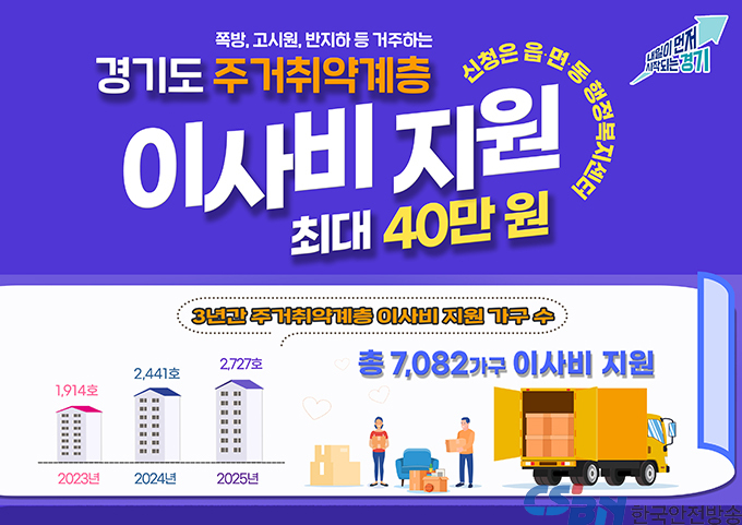 경기도가 쪽방, 고시원, 반지하 등 열악한 주거환경에 거주하고 있는 주거취약계층의 안정적 이주를 위해 올해도 ‘주거취약계층 이사비 지원사업’을 이어간다.