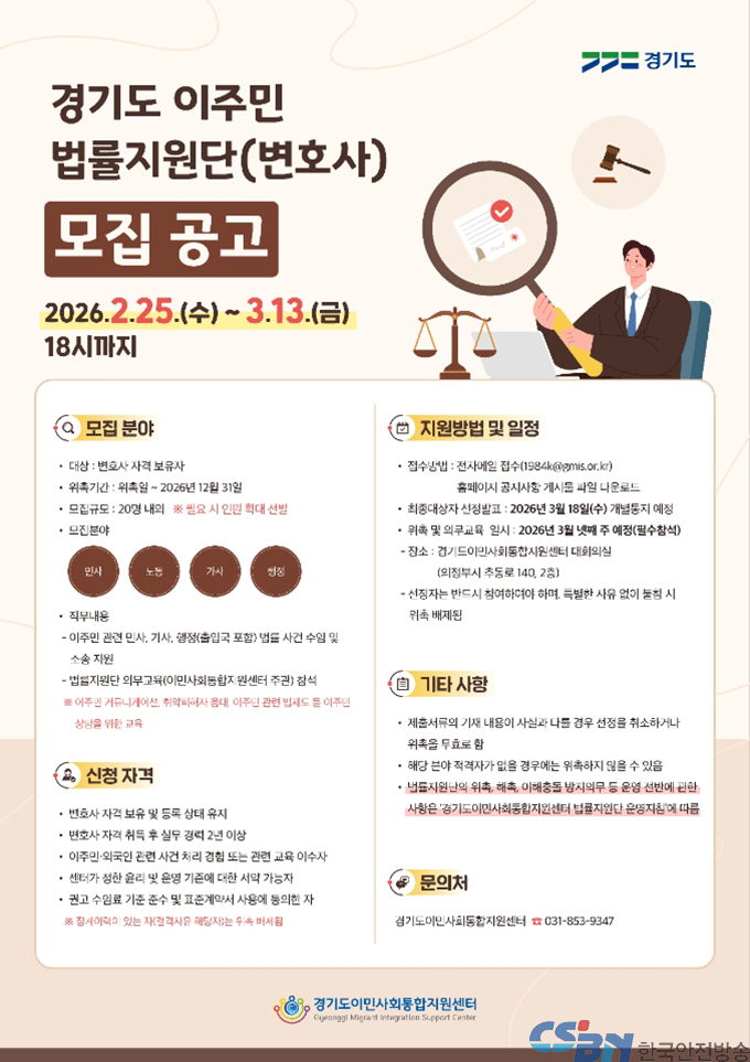 참여를 희망하는 변호사는 경기도이민사회통합지원센터 누리집(gmis.or.kr)에서 제출서류를 내려받아 3월 13일까지 전자우편으로 제출하면 된다. 기타 자세한 사항은 경기도이민사회통합지원센터(031-853-9347)에서 안내받을 수 있다.