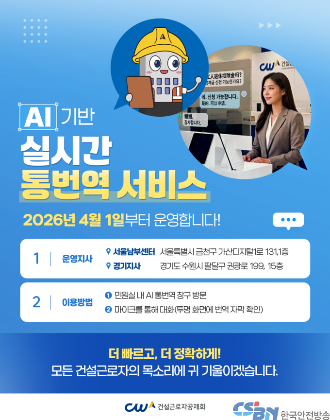 공제회 김창석 고객사업본부장은 “이번 AI 기반 통번역 서비스 도입은 디지털 기술을 행정 서비스에 접목하여 고객 편의를 극대화한 사례”라며, “앞으로도 모든 건설근로자가 소외됨 없이 편리하게 업무를 이용할 수 있도록 스마트한 민원 환경을 지속적으로 조성해 나갈 것”이라고 강조했다.