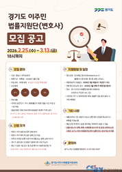 웹포스터(자료 경기도) 경기도는 3월 13일까지 ‘경기도 이주민 법률지원단 지원사업’에 참여할 변호사를 모집한다. 이주민 법률지원단은 언어·문화적 장벽과 정보 부족으로 법률서비스 이용에 어려움을 겪는 도내 취약계층 이주민에게 전문적인 소송 지원을 제공하기 위해 기획됐다. 도는 ▲민사(노동 포함) ▲가사 ▲행정(출입국 포함) 분야를 중심으로 20명 내외의 변호사 인력을 구성해, 체계적이고 신뢰할 수 있는 법률 지원 체계를 구축할 계획이다. 모집 대상은 변호사 자격을 보유하고 2년 이상의 실무경력을 갖춘 사람이다. 이주민·외국인 관련 사건 경험이 있거나 관련 교육을 이수한 경우 가점이 부여된다. 선정된 변호사는 의무교육을 이수한 뒤 4월 초부터 사건 지원을 시작한다. 위촉 기간은 위촉일로부터 2026년 12월 31일까지다. 도는 과도한 수임료 부담을 방지하기 위해 사건 유형별 권고 수임료 가이드라인을 제시하고, 표준계약서 사용을 통해 계약의 투명성을 높일 계획이다. 실제 수임료는 의뢰인과 변호사 간 계약에 따라 결정된다. 참여를 희망하는 변호사는 경기도이민사회통합지원센터 누리집(gmis.or.kr)에서 제출서류를 내려받아 3월 13일까지 전자우편으로 제출하면 된