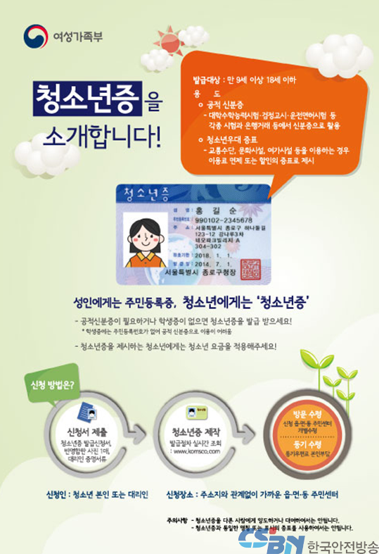 여성가족부는 지난 2003년 청소년 우대 혜택을 차별 없이 지원받을 수 있도록 신분(연령) 확인을 위한 청소년증 발급 제도를 처음 도입하고, 2014년 12월부터는 주소지에 관계없이 전국 어디서나 가까운 주민센터에서 청소년 본인 이외 대리인도 발급 신청을 할 수 있도록 개선한 바 있다.