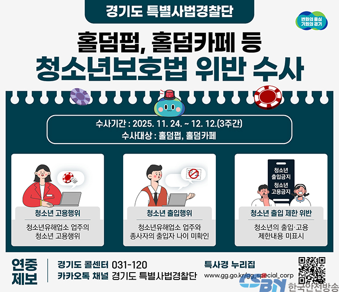 경기도는 11월 24일부터 12월 12일까지 3주간 도내 홀덤펍, 홀덤카페를 대상으로 청소년의 출입·고용 등 불법행위를 집중 수사한다.
