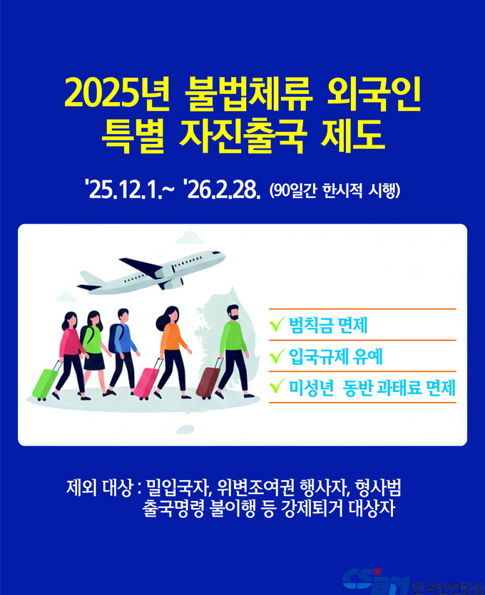 법무부가 불법체류 외국인의 자진 출국을 유도하기 위해 오는 2025년 12월 1일부터 2026년 2월 28일까지 90일간 한시적으로 「불법체류 외국인 특별 자진출국 제도」를 시행한다고 밝혔습니다. 이번 조치는 불법체류자들이 범칙금 납부 부담과 향후 대한민국 재입국 시 발생할 수 있는 입국 규제에 대한 우려 없이 본국으로 돌아갈 수 있도록 지원하는 파격적인 정책으로 평가됩니다.