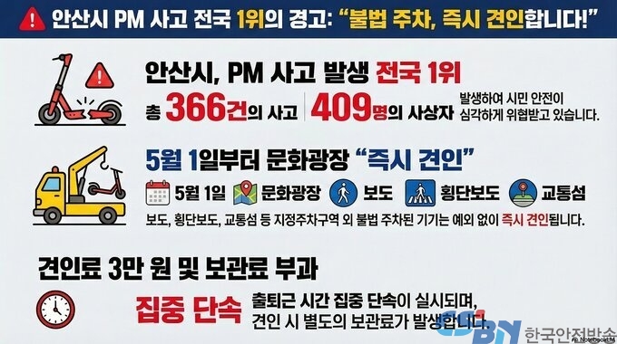 시는 내달 1일부터 안산문화광장 일대를 대상으로 즉시 견인 시범운영을 실시할 계획이다. 단속 대상은 도로교통법상 개인형 이동장치로, 지정된 주차장 외 보도, 교통섬, 횡단보도 등에 불법 주정차된 기기다.