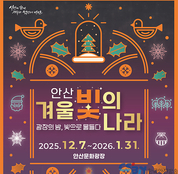 행사홍보자료(안산시) 안산시(시장 이민근)는 주말인 오는 7일을 시작으로 내년도 1월 31일까지 두 달여 간 고잔동 안산문화광장 일대에서 겨울 야간 축제, ‘2025 안산 겨울 빛의 나라’를 개최한다고 1일 밝혔다. ‘2025 안산 겨울 빛의 나라’ 축제는 시민과 관광객에는 화려한 조명으로 가득찬 문화광장의 아름다운 풍경을, 침체한 지역 경제에는 새로운 활력을 제공하고자 기획됐다. 시는 안산문화광장 내 ‘물의 광장’부터 ‘갤러리 광장’에 이르기까지 약 1km 구간을 빛 조형물과 다채로운 포토존으로 구성, 시민들에게 잊지 못할 겨울 추억을 선사한다. ■ 12월 7일 점등식 개최… 볼거리ㆍ즐길 거리 풍성 축제의 화려한 시작을 알리는 개막 점등식은 오는 7일 오후 4시 50분, 안산문화광장 썬큰광장에서 열린다. 안산시립합창단의 식전공연을 비롯해 점등 퍼포먼스, 가수 호림과 핫(HOT) 서커스 아트네이블의 공연이 진행돼 축제 분위기를 한층 고조시킨다. 이날 안산국제거리극축제 공식 인스타그램 팔로워 900명(선착순 한정)에 호빵을 증정하는 특별 이벤트도 진행된다. 축제 기간에는 빛 조형물뿐만 아니라, 회전목마(12월 주말 및 성탄절 운영, 유료), 체험 프로그램, 특