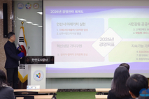 안산도시공사(사장 허숭)는 5일 2026년 시무식을 열고 시민 중심 서비스 확대를 핵심으로 한 새해 경영목표와 중점 추진 방향을 공유하며 새로운 한 해의 출발을 다짐했다. 본사 대회의실에서 이날 열린 시무식에서는 CEO 신년사를 통해 지난 한 해의 성과를 공유하고, 2026년 경영목표와 주요 과제 등을 논의했다. 공사는 올해 ▲자체사업 매출액 100억 원 달성 ▲시민 맞춤형 서비스 확대 ▲창의적·협력적 조직문화 조성 ▲ESG 경영 S등급 달성을 주요 경영목표로 제시했다. 우선 장상·신길2 공공주택지구 및 신길일반산업단지 조성사업 등을 중심으로 자체사업 매출 100억 원 이상 달성을 목표로 설정했다. 향후 수천억 원 규모의 매출이 예상되는 중장기 사업이지만, 본궤도에 오르기 전 초기 성과를 창출하고 사업이 본격적으로 확장되기 전이라는 ‘출발’의 의미를 담았다. 공사는 이번 매출 목표 달성을 통해 대규모 개발사업 확대를 위한 재정적·조직적 실행력을 검증하고, 단계적인 사업 확장의 발판을 마련한다는 계획이다. 또 시민 참여형 취미·문화 프로그램을 확대하고 , AI·클라우드 기반 디지털 업무혁신을 통해 업무 효율성과 서비스 품질을 동시에 높인다는 방침이다. 아울러